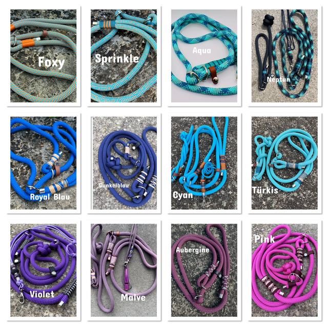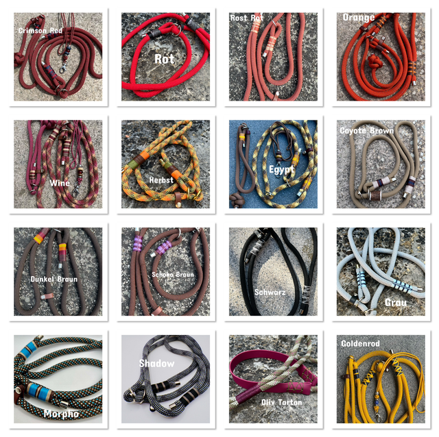 Stell dir deine perfekte Retrieverleine zusammen – du wählst die Farbe, und alles Weitere besprechen wir gemeinsam (Länge, Farbe und Art der Flechtung,…)